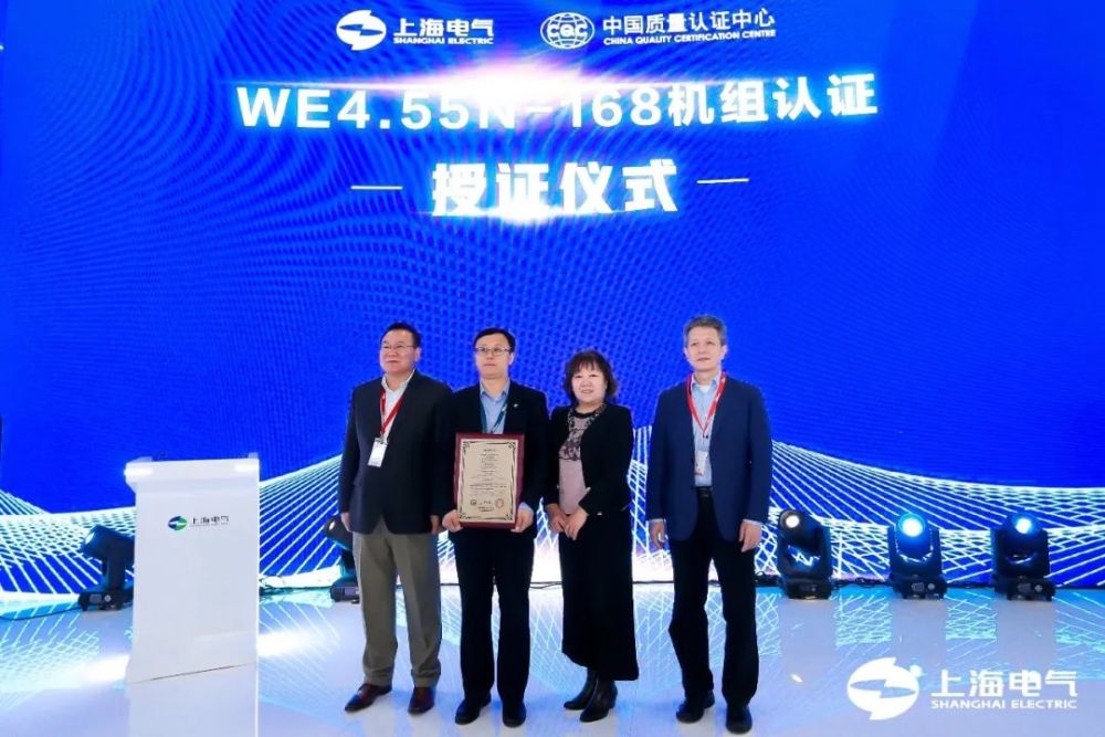 10月14日下午,上海电气WE4.55N-168数字化陆上风机设计认证颁证仪式举行。第三方权威认证机构中国质量认证中心市场总监兼新能源处长邢合萍为新机型颁发了设计认证证书,上海电气风电集团副总工程师兼陆上产品线总监马文勇代表公司获颁证书。中国质量认证中心副主任宋向东、上海电气风电集团首席数字官兼技术总经理康鹏举出席见证。