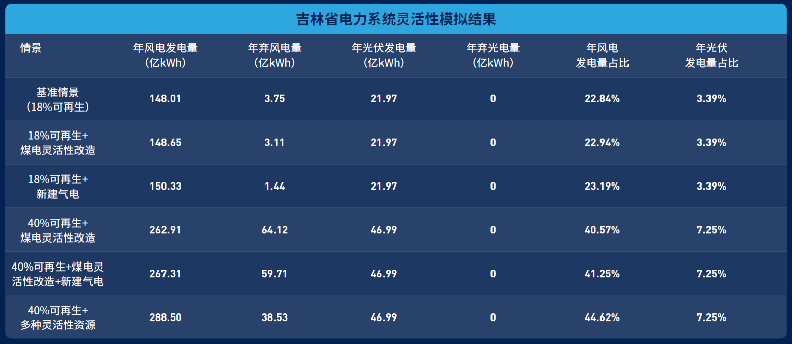 《报告》系统分析了中国电源侧、电网侧和用户侧各类灵活性资源的技术和经济特性,以及中国目前技术型、市场型和规划型灵活性发展的现状和发展空间,综合考量灵活性资源成本和时间尺度,提出了针对中国的电力系统灵活性提升路线图。《报告》还选取可再生能源消纳矛盾突出的吉林省为例,分别模拟了6种电力系统运行情景,其中在高渗透率算例中,加入多种灵活性资源较仅依靠煤电灵活性改造,弃风电量将可减少39.9%,煤电启停次数和启停成本分别下降27.19%和25%。