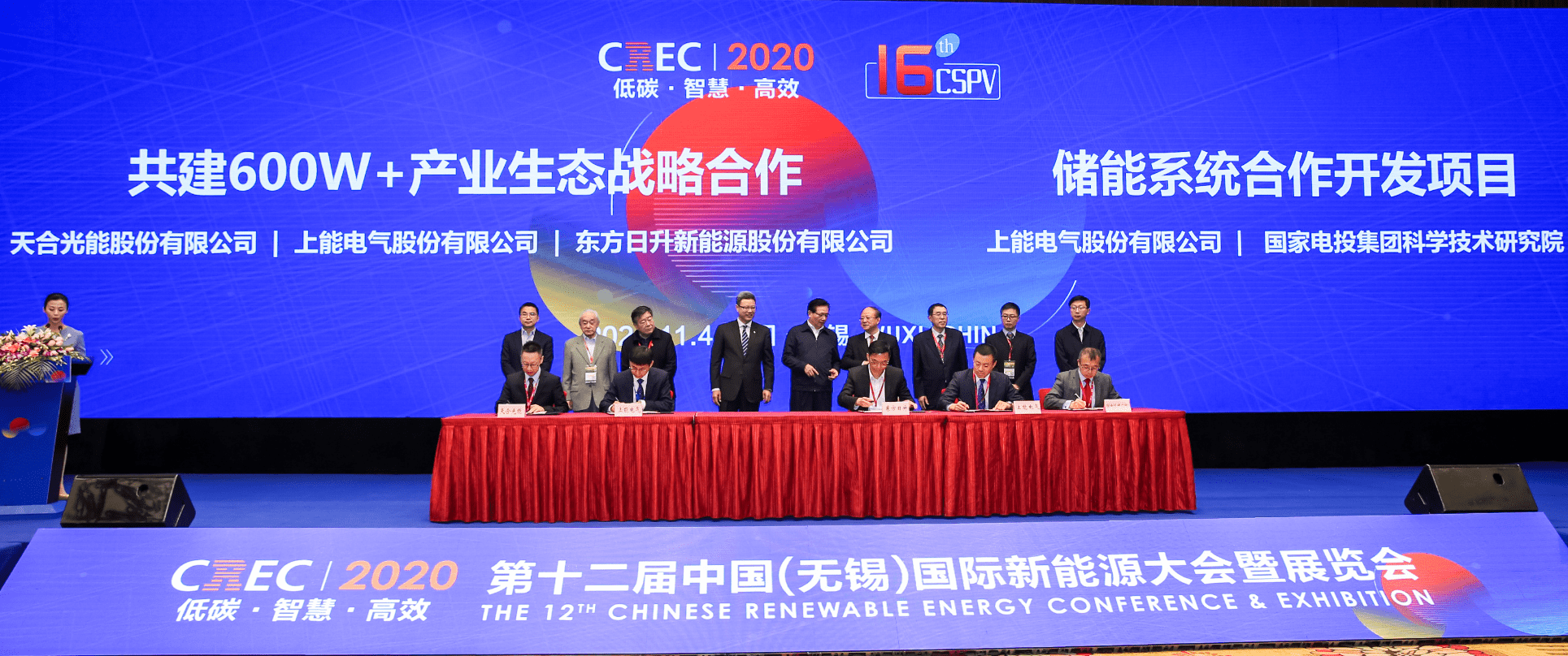 11月4日-6日,由中国国际商会和无锡市人民政府主办的“第十二届中国(无锡)国际新能源大会暨展览会”在无锡隆重举行,多个重点项目在现场签约。其中,东方日升与上能电气、天合光能共同签订“共建 600W+产业生态”战略合作协议。