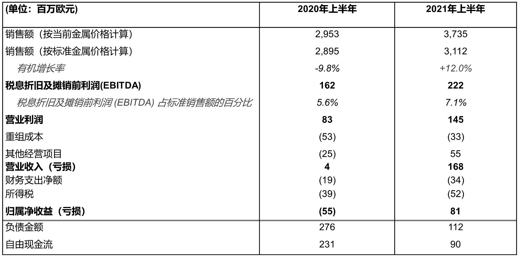2021年上半年,按标准金属价格计算的销售额达31.12亿欧元,与上年同期相比实现内生增长12%,其中第二季度同比增长24.2%,反映了需求回升及有效的产品组合和价格管理。