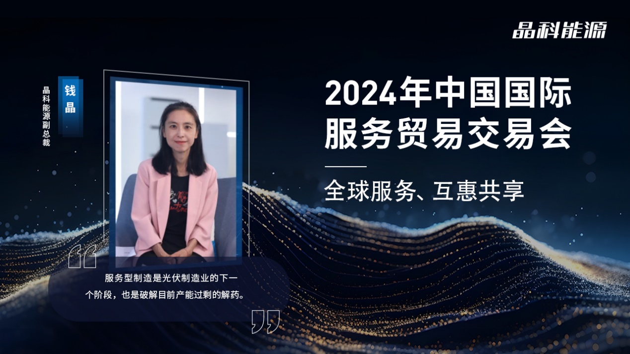9月12-16日,2024年中国国际服务贸易交易会(简称“服贸会”)在北京正式开幕,国家主席习近平在开幕之际向服贸会致贺信。本届服贸会秉承“全球服务、互惠共享”主题,吸引450多家世界500强和行业龙头企业线下参展。晶科能源作为全球领先的光伏及储能企业受邀出席服贸会,并在“企业全球化”等重磅论坛上,就气候变化和双碳目标驱动下的可再生能源产业、企业应对全球化变局的新思考新实践等相关议题,做主旨发言。