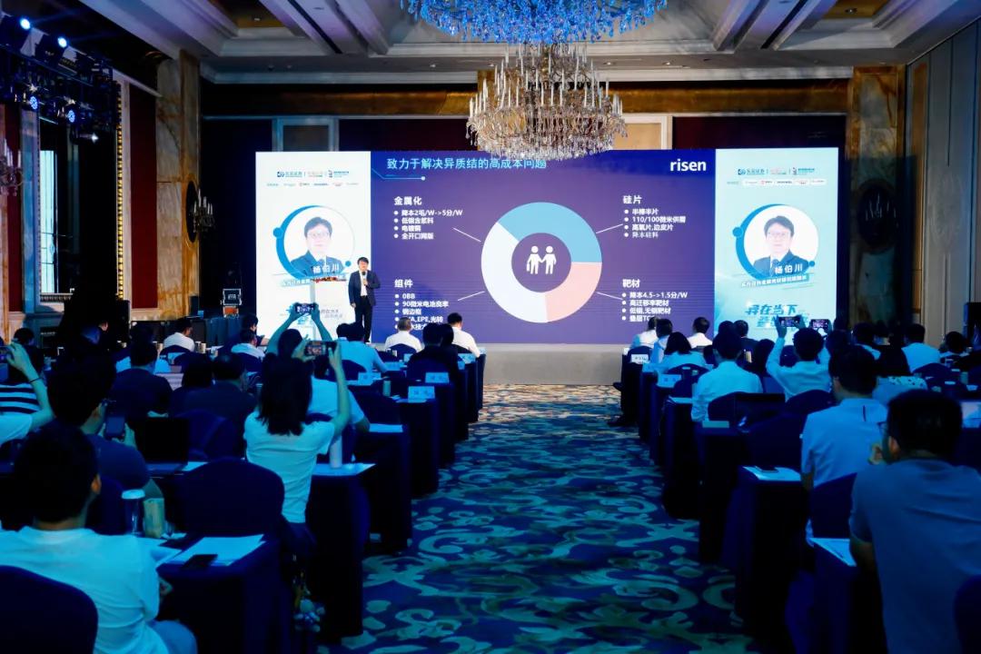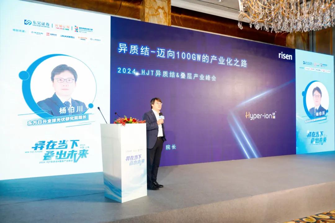 作为全球领先的光伏智慧能源整体解决方案供应商,东方日升受邀参与此次盛会,东方日升全球光伏研究院院长杨伯川博士在现场发表题为《异质结-迈向100GW的产业化之路》的主题演讲,提出异质结全产业迈向100GW产业化的三大指标,即异质结单瓦银耗成本小于PERC、远小于TOPCon,推进测量手段的精准化跟标准化,批量出货组件功率超过TOPCon 30W,并分享东方日升如何通过技术创新和产品升级,在异质结技术领域持续领跑行业。