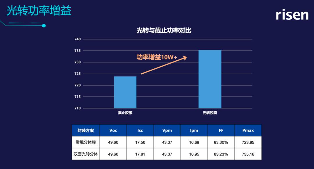 光伏电池技术的不断进步和演变,离不开钝化膜材料和工艺的持续优化,然而随着钝化效果越好,同时也带来了电池更容易受到紫外的影响,TOPCon如此,异质结更是如此。为了消除紫外对电池钝化膜的影响,,东方日升在异质结组件封装领域进行了大量的研究和实验,在继使用高截止型封装胶膜的伏曦1.0产品的基础上,创新性地推出了优化后的“光转膜技术”封装方案,利用光转胶膜可将紫外光变为可见光,不仅保护电池片免受紫外线侵害,还能利用紫外线的能量进一步提升异质结组件的发电增益。通过持续的技术提升和工艺优化,东方日升正向出货组件的功率超过TOPCon 30W以上的目标持续前进。
