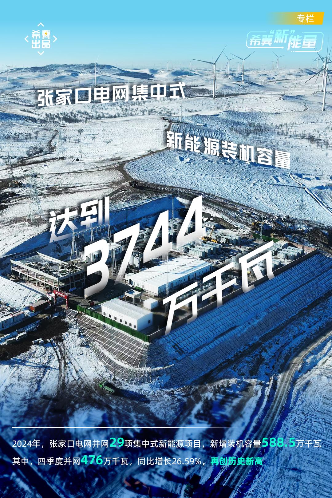 张家口地区地处京畿、环绕首都,风光资源富集。近年来,国网张家口供电公司积极服务新能源项目并网。2024年,张家口电网并网29项集中式新能源项目,新增装机容量588.5万千瓦,其中四季度并网476万千瓦,同比增长26.59%,再创历史新高。截至目前,张家口电网集中式新能源装机容量达到3744万千瓦,储能装机94.65万千瓦,为首都和河北地区持续输送“稳稳的绿电”。