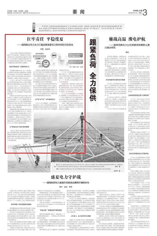 9月17日,《中国电力报》3版头条刊发长篇通讯《扛牢责任 平稳度夏》,报道国网冀北电力坚持扛牢电力保供责任,迎峰度夏期间通过加强负荷管理、强化精益运维、积极应对防汛救灾等务实举措,全力打赢迎峰度夏电力保供和防汛攻坚战的实践。