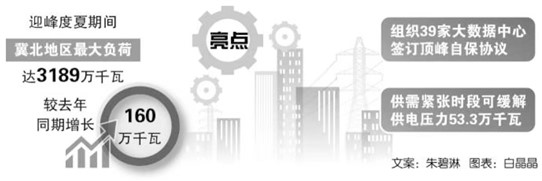 迎峰度夏期间,冀北地区最大负荷达3189万千瓦,较去年同期增长160万千瓦。冀北电力密切跟踪天气信息,通过建立健全与大用户及地方政府的沟通机制,在保供紧张时段引导企业错峰生产。鼓励引导近2000户市场用户参与负荷精准调节,组织39家大数据中心签订顶峰自保协议,供需紧张时段可缓解供电压力53.3万千瓦,实现电力资源最优配置。