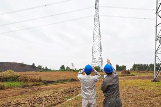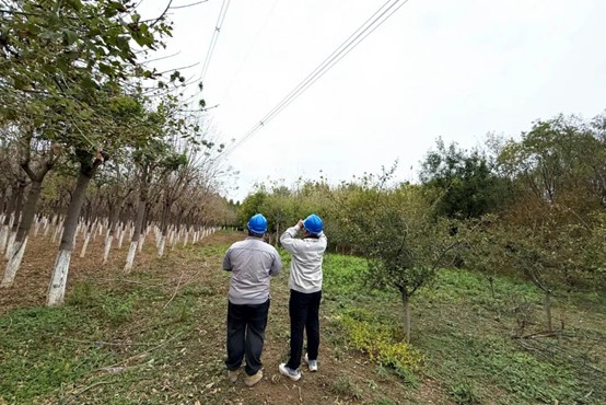 ▲送变电公司唐山运维工区巡视小组对500千伏安裕一二线进行树障隐患排查(张天宇摄)