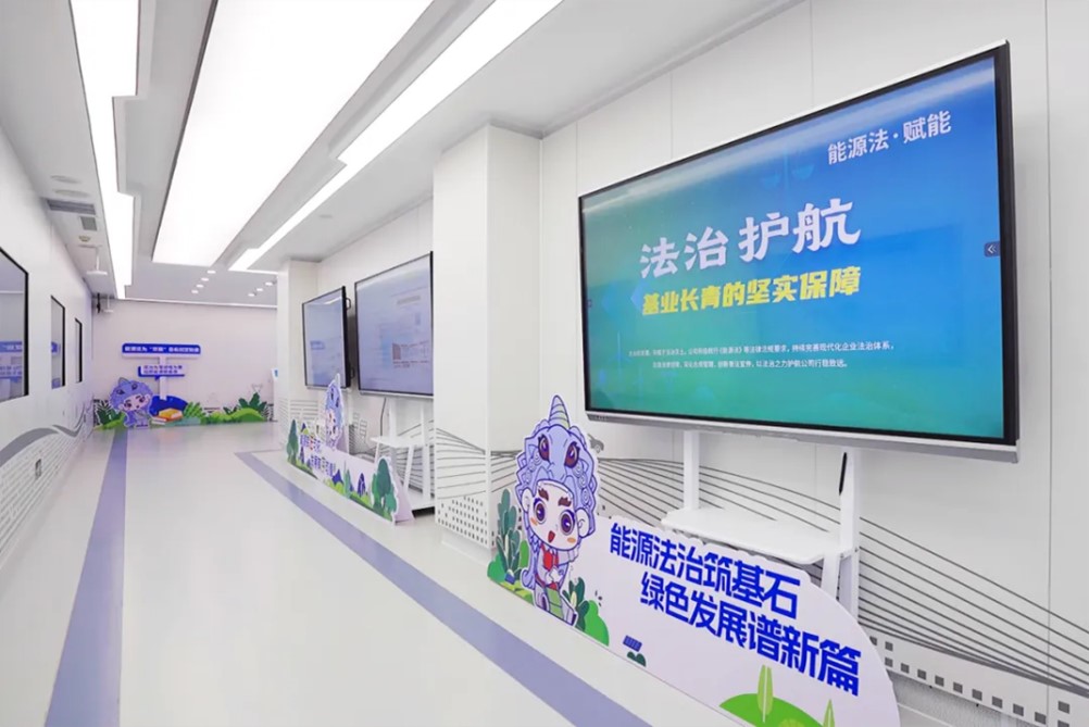 基地以实体展厅为载体,整体设计贯彻绿色环保理念。展厅分为序厅和四大展区:序厅重点呈现国家能源战略有关论述,并循环播放《能源法》专题宣传片;第一展区“能源法·起航”,系统梳理我国能源法律体系与立法进程,阐释《能源法》的立法宗旨与核心制度;第二展区“能源法·赋能”,展示该公司践行能源法治、推进法治企管的具体举措与普法成果;第三展区“能源法·践行”,展现《能源法》在电网规划、建设、运行及用户服务等环节的落地实践;第四展区“能源法·未来”,展望该公司能源法治建设的未来目标与发展路径。