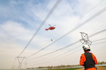 ▲2025年4月8日,国网唐山供电公司联合国网空间技术有限公司,利用直升机对500千伏唐安一线进行带电消缺(周宇翔摄)