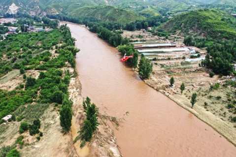 ▲2025年7月31日,在承德双滦区西地镇附近的洪泛区上空,直升机悬吊作业人员正处理110千伏周上线72-73号塔导线上的搭挂树木(赵天一摄)