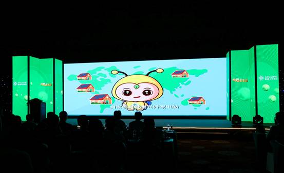 大会现场,吉祥物“康康”以动画视频与人偶表演的形式首次亮相,圆润可爱的形态、软萌可人的声音,一下子吸引住全场嘉宾的目光。据相关负责人介绍,“康康”的造型创意来源于蜜蜂形象。众所周知,蜜蜂采集花粉为人类带来甜蜜,也一直是勤劳、奉献、团结等美好精神的象征,而“康康”的形象正是寓意其孜孜不倦地采集阳光为人类带来绿色能源。只见“康康”扇动着组件翅膀,吸收光能转换成电能,头上触角随即一亮一亮,表示其产生的电能正源源不断地输送到家庭生活各处,额前一片绿叶更是象征着清洁能源带给世界的绿色环保。