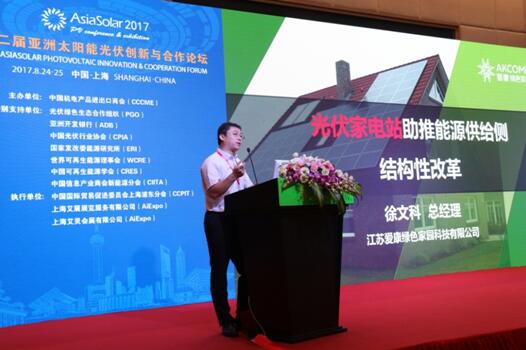 2017年8月24-26日,第十二届亚洲太阳能光伏创新技术展览会暨合作论坛在上海跨国采购会展中心隆重召开,同期也是首届中国分布式及户用光伏品牌加盟展览会的盛大开幕,爱康绿色家园作为户用分布式光伏企业中的领跑成员,也受邀参与此次亚洲光伏盛会,以“有家就有爱康五好家电站”为主题,打造了一个与光伏从业人员同交流、促发展的分享空间。并且在本次大会 颁奖典礼中荣获双项大奖。爱康绿色家园总经理徐文科先生在展会论坛中发表主题演讲。