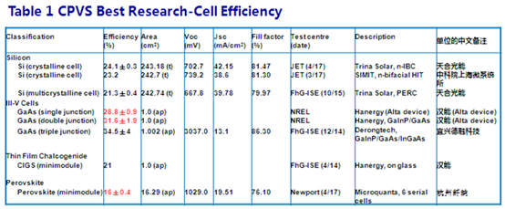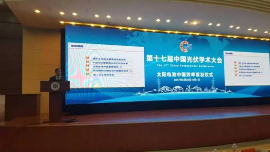 为进一步推动我国光伏技术的创新发展,全面、系统、权威、及时地展示我国太阳电池达到的光电转换效率最高水平,促进从光伏制造和应用大国向创新强国转变,中国可再生能源学会光伏专业委员会(CPVS)决定从2017年开始进行太阳电池中国最高效率(CPVS BestResearch-Cell Efficiency)和特定结构太阳电池中国最好效率(CPVS Research-Cellefficiency with notable characteristics)征集活动,太阳电池中国最高效率(第一版)于第十七届中国光伏学术大会开幕式举行首发仪式。