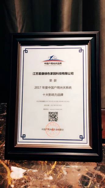 9月19日, 2017年度中国户用光伏十大影响力品牌颁奖典礼在济南万达凯越酒店隆重举行,本次盛会由中国生产力促进中心协会主办,全国60多家光伏品牌企业参与角逐。作为国内户用光伏领跑企业,爱康绿色家园受邀参加此次大会,并荣膺“户用光伏系统十大影响力品牌”大奖。