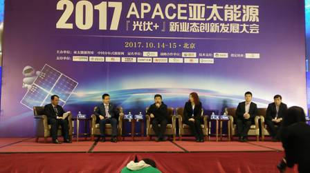 2017年10月15日,APACE亚太能源2017『光伏+』新业态创新发展大会在北京市顺义区举行。活动由亚太能源智库、中国分布式能源网联合主办,北京亚太未来能源投资有限公司承办,分众传媒、航美传媒、宾臣传媒为媒体主办,爱康集团、协鑫新能源、阳光电源等作为支持单位。