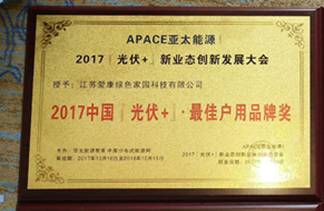 大会以“驱动与引领”为主题,共同探讨光伏与其他产业的共生融合新业态发展,推动“光伏+”新业态创新升级。该“光伏+”总评榜,以树榜样,广传播为宗旨,通过公开、公平、公正、公示的评选环节,评选出光伏行业各相关领域优秀的企业,从而推进中国光伏应用“技术+创新+品牌”国际化进程。爱康绿色家园凭借其卓越的产品品质、独特的技术创新、全面的渠道建设等雄厚实力荣获2017中国『光伏+』·最佳户用品牌大奖。