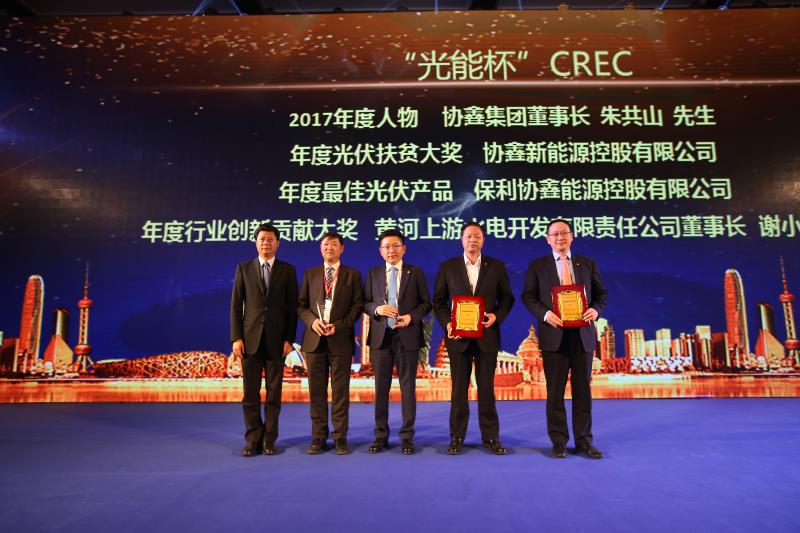 2017年11月1日,第九届中国(无锡)国际新能源大会暨展览会在无锡热情启幕。在当晚举行的“光能杯”CREC年度颁奖典礼中,协鑫新能源凭借其优异的光伏电站开发业绩及在光伏扶贫中做出的突出贡献,获得了“年度光伏投资企业”及“年度光伏扶贫大奖”两个奖项。