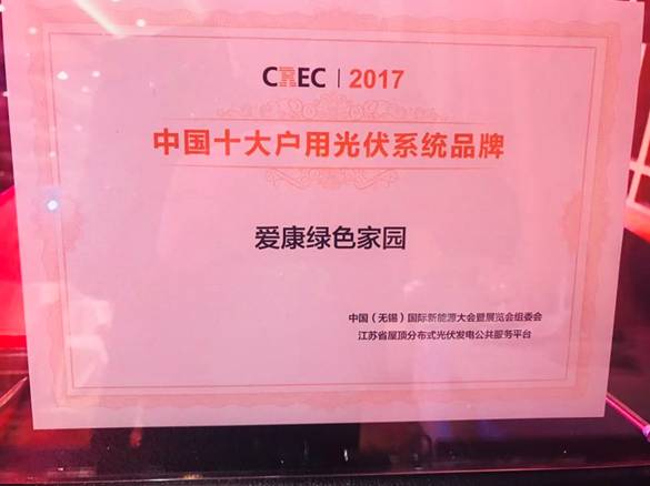 2017年11月2-4日,“第九届中国(无锡)国际新能源大会暨展览会(CREC2017)”在无锡太湖国际博览中心举行。本届展会以“新城镇、新能源、新生活”为主题,将展示太阳能光伏、分布式能源、储能、能源互联网以及新能源汽车、充电桩等产品与业务。同期主办方于3日晚在无锡君来世尊酒店举办了“尚德·益家”分布式光伏业务主题晚宴并隆重举行“中国十大户用光伏品牌评选”颁奖仪式,江苏爱康绿色家园科技有限公司作为受邀嘉宾参加此次评选并荣获2017年”中国十大户用光伏系统品牌”大奖。