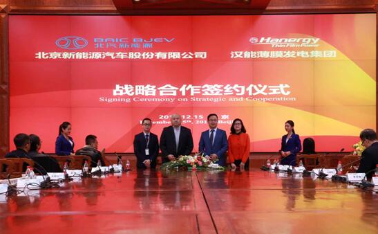 2017年12月15日,北京——汉能薄膜发电集团(00566.HK)在北京总部举行的“绿色中国——汉能生态城市综合解决方案”发布会上,与北京新能源汽车股份有限公司(简称北汽新能源)签署战略合作协议,双方将在“智慧交通,绿色出行”的合作框架内,推进汽车天窗车顶解决方案、新能源汽车充换电站、共享电动汽车、园区及厂房分布式能源建设、农业光伏扶贫、特色小镇建设等领域开展全方位合作,拓展薄膜太阳能技术在“住与行”领域的应用范围。