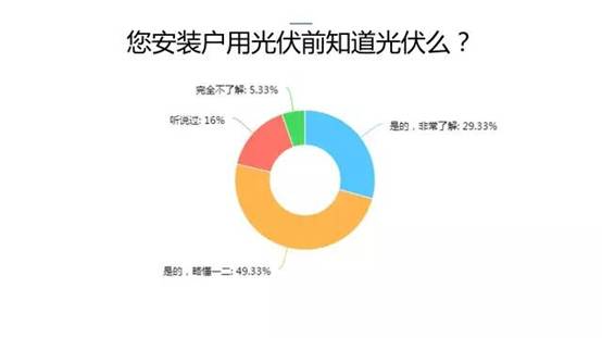 第一、用户对户用光伏的产品认知尚待完善。户用分布式电站是一个介于家电和工业品之间的产品,这一产品属性加之户用光伏市场依然处于成长建设阶段,用户不了解户用光伏产品。经过户用光伏大会对1592份有效数据的分析,在安装过户用光伏的用户中,70%以上的用户都只是知道、听说过或者完全不了解光伏,只有29.3%的人是在安装之前就对光伏非常了解的,所以品牌商和经销商目前还需要做大量科普宣传工作,用户才会了解;