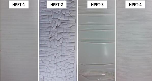 对于背板内层来讲,耐紫外性能也很重要。目前很多电站中仍然能够看到大量KPE(PVDF/PET/E层)和PET类型背板内层发黄的案例,这是由于部分使用PVDF和PET背板厂家选择的E层材料配方或胶水不合格导致的。通过实验室的紫外老化测试也可以看到(图4),有些厂家的背板内层在紫外老化实验后出现了严重的开裂。所以选择产品已在户外长期使用的品牌,是十分必要的。