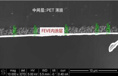 图6 某PVDF/PET/FEVE背板内层FEVE涂层只有1.3微米