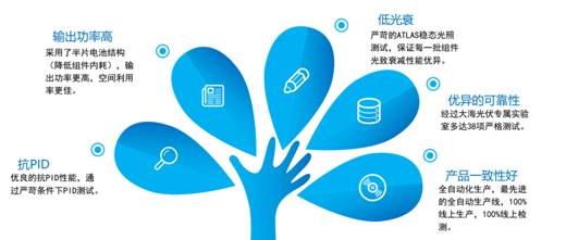 ◆抗PID性能。通过业界严苛条件下的抗PID(电势诱导衰减)权威测试(85℃/85%RH,96小时)下,PID现象造成的衰减率将至最低;
