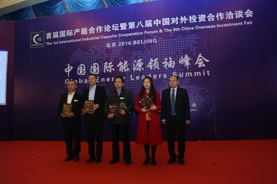 | 中海阳创始人薛黎明与中海阳能源集团股份有限公司分别荣获组委会评选出的2016年度中国能源产业领军人物奖、中国能源企业杰出成就奖。 |