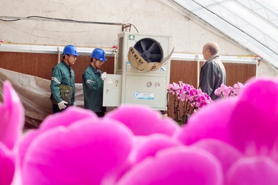▲国网丰宁县供电公司凤山镇供电所员工在蝴蝶兰基地对风机机组进行安全检查(孙婷婷摄)