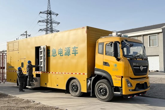 ▲国网蔚县供电公司员工对应急发电车进行维护(张韬摄)