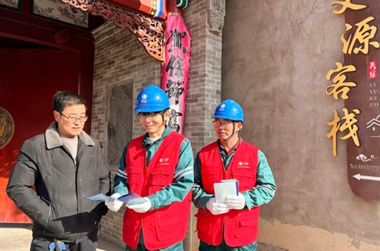 ▲国网蔚县供电公司员工走访调研民宿用电需求(张韬摄)