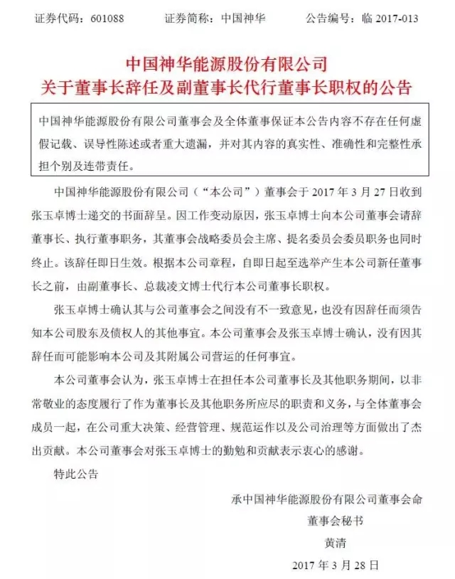 中国神华发布公告,公司董事会于2017年3月27日收到张玉卓博士递交的书面辞呈。因工作变动原因,张玉卓博士向本公司董事会请辞董事长、执行董事职务,其董事会战略委员会主席、提名委员会委员职务也同时终止。该辞任即日生效。