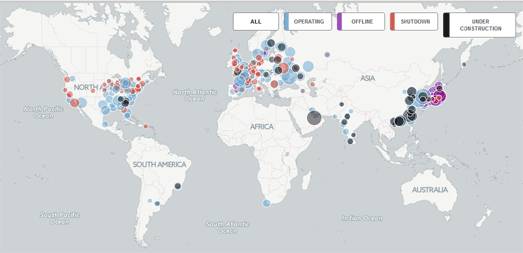 2017年1月1日,13个国家55台核电机组在建,其中亚洲34台(中国21台),东欧10台,中东4台。在这55台在建机组中,35台的工程逾期(中国的21台在建机组中也有9台严重逾期)。