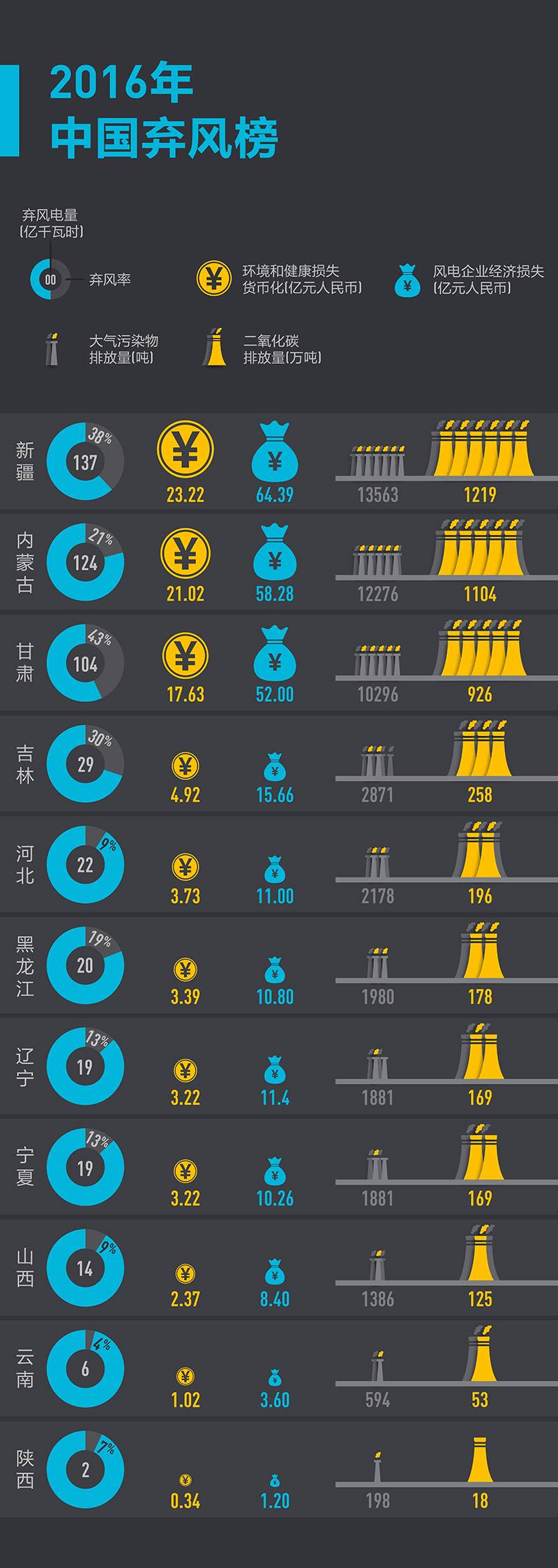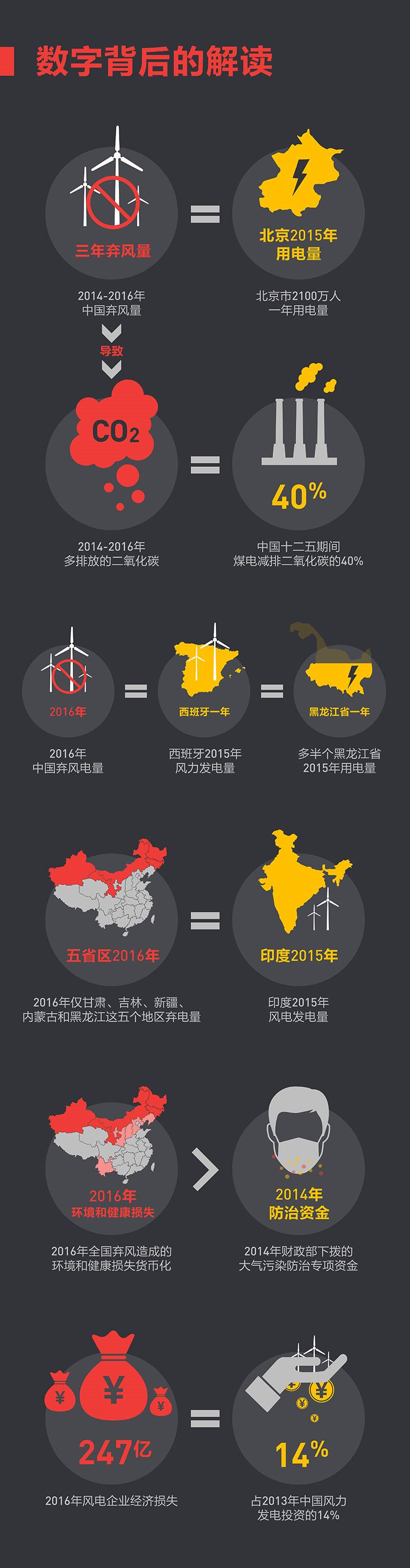 这组数字的比较,更让我们对弃风造成的损失感到震惊:2016年中国浪费的风电,就可以供一个大城市用一整年。弃掉清洁的风电,不仅造成了风电企业的经济损失,也大大削弱了其他领域节能减排、污染防治的效果。