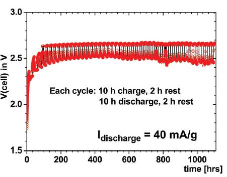 研究人员还发现,这种电池能在保持很低的电池内阻情况下,能实现多达1200余次的充放电。下图给出了电池长达1000多小时的充放电测试曲线。从这个电压-时间曲线中,可以看出这款新型锂-硫电池在很长的循环寿命中,仍然能够保持非常稳定的放电电压。