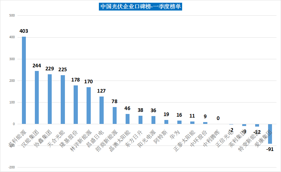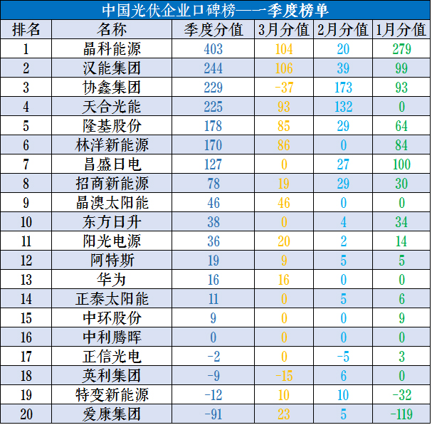一季度,20家光伏样本企业口碑总分值为1715。非常可惜的是,由于光伏企业口碑榜推出较晚,我们没有同比数据可供参考。但以我们的经验而言,这个数值并不低。