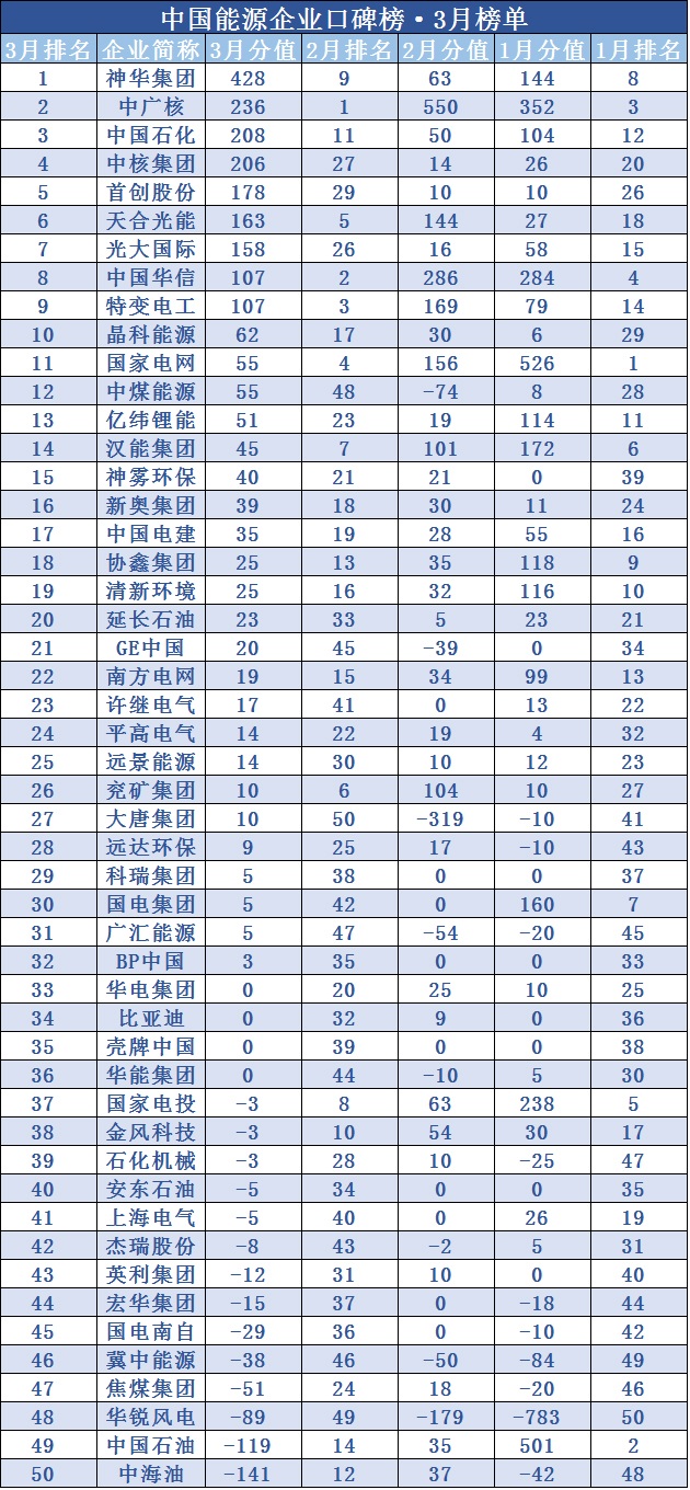 以下为“中国能源企业口碑榜—3月榜单”的子榜单: