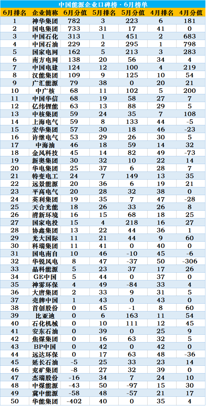 以下是“中国能源企业口碑榜——6月榜单”的子榜单: